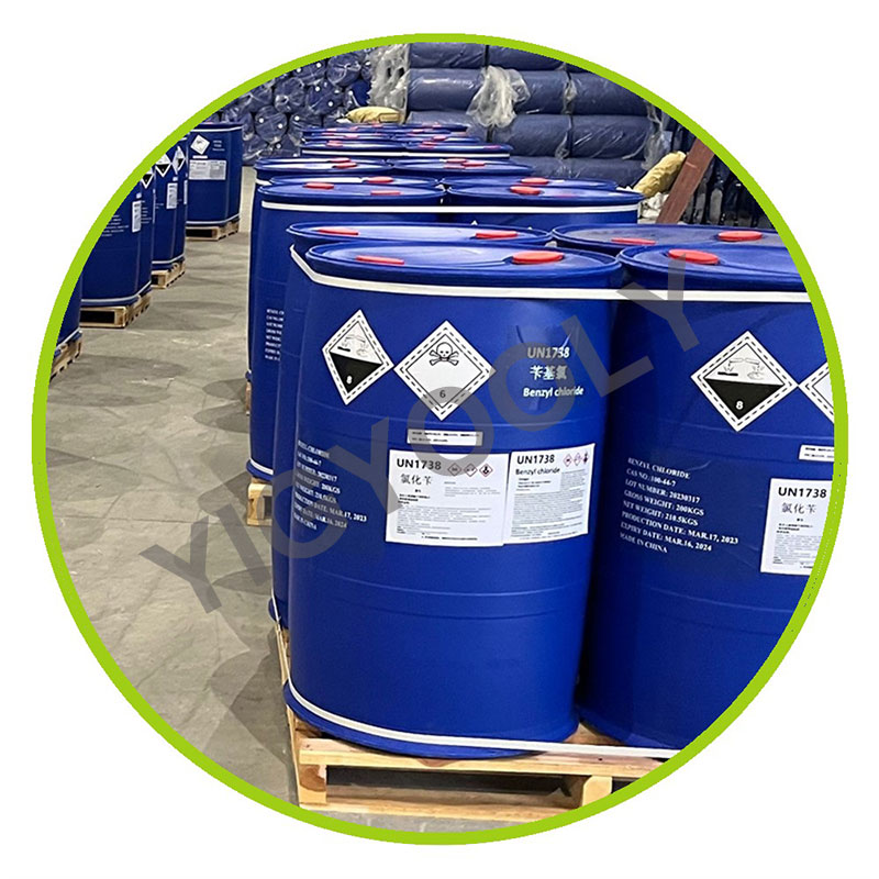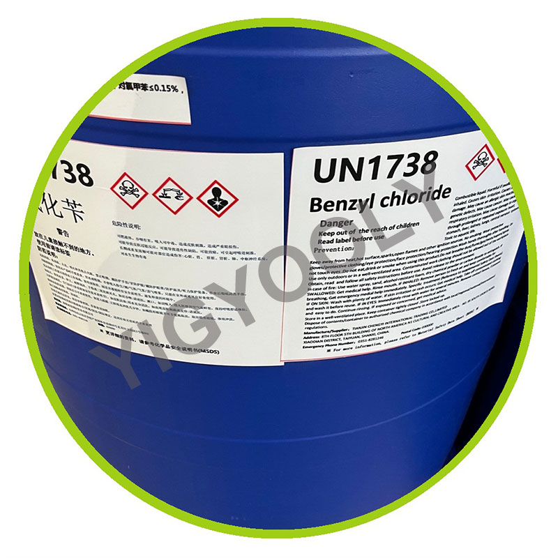 YIGYOOLY China leverde grotendeels benzylchloride is een organische verbinding, een kleurloze of lichtgele transparante vloeistof met een scherpe geur. Het is onoplosbaar in water en kan worden gemengd met de meeste organische oplosmiddelen zoals ethanol, chloroform en ether. Het is een belangrijk chemisch en farmaceutisch tussenproduct. Het zijn organische synthesetussenproducten die veel worden gebruikt in de geneeskunde, pesticiden, kruiden, kleurstofadditieven, synthetische harsen en andere gebieden.
